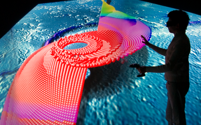 • Großprojektionsanlagen wie das Siegener VR Labor bieten große Projektionswände und auch Bodenprojektion, um die virtuelle Umgebung auf einen möglichst großen Bereich rund um den Benutzer projizieren zu können.